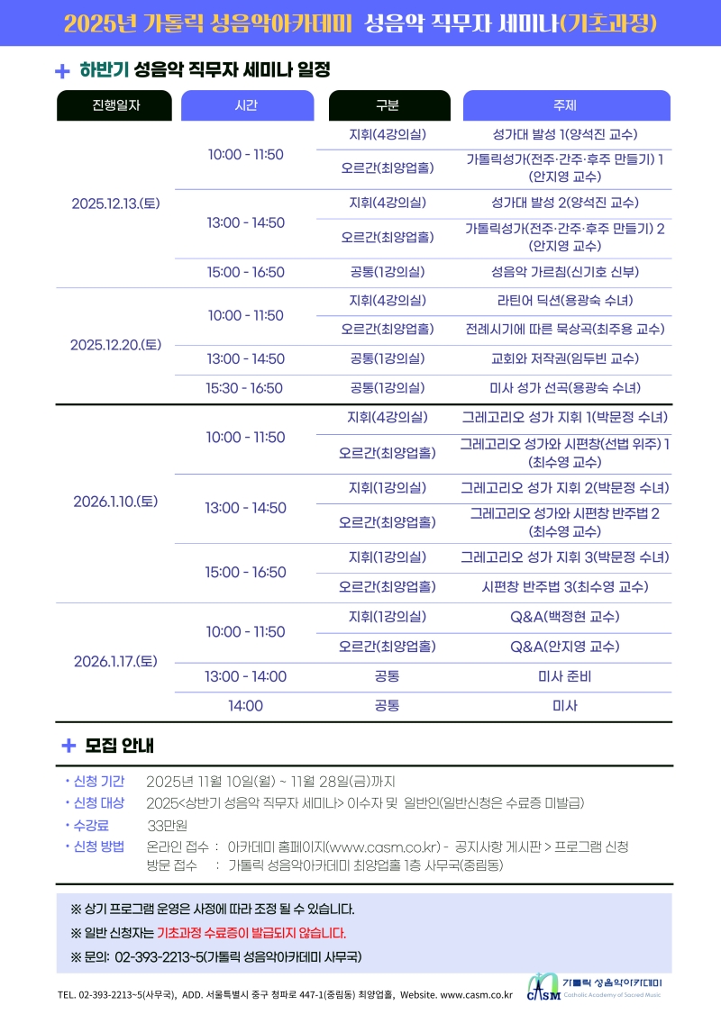 [가톨릭 성음악아카데미] 2025 하반기 성음악 직무자 세미나 신청 안내(기초과정)